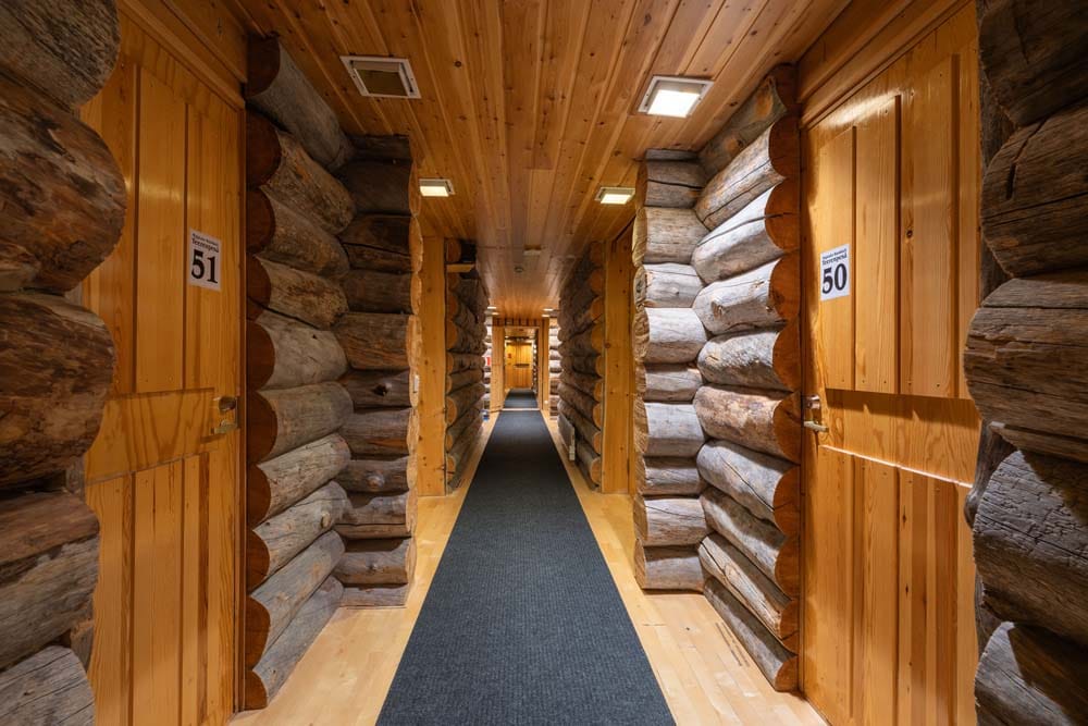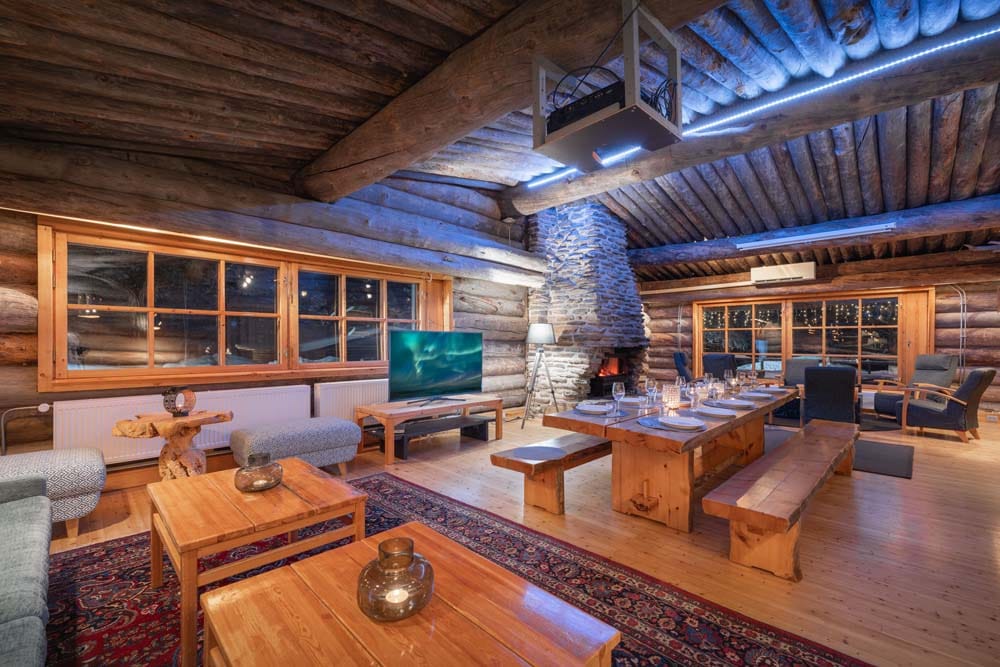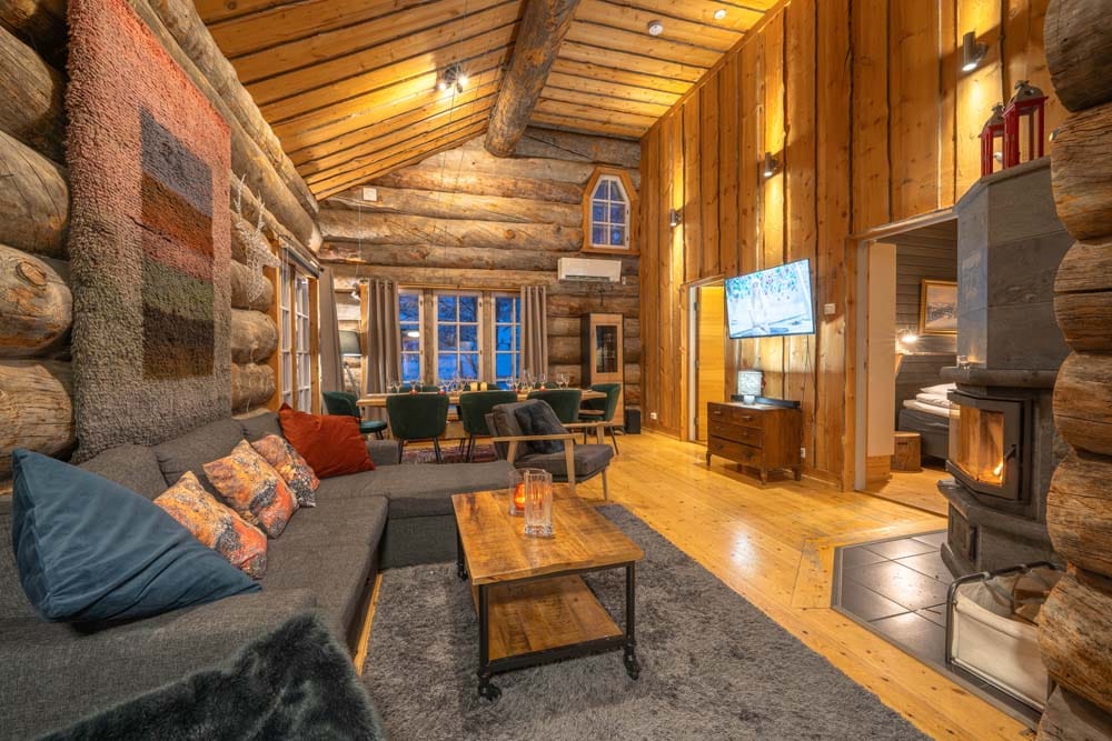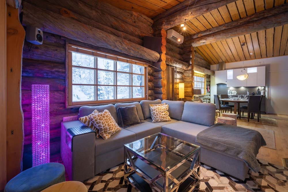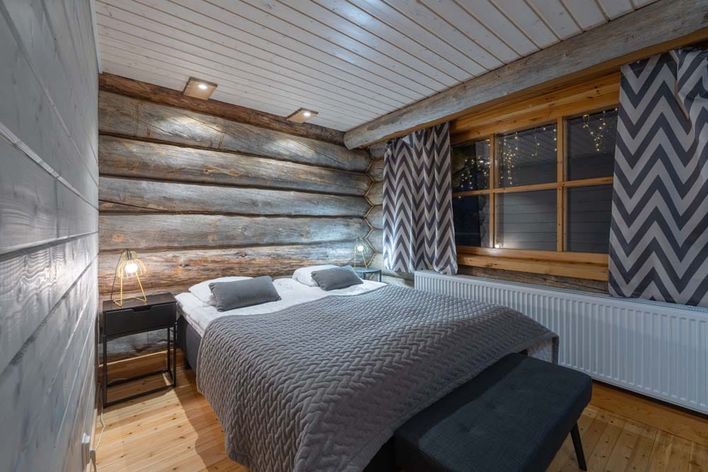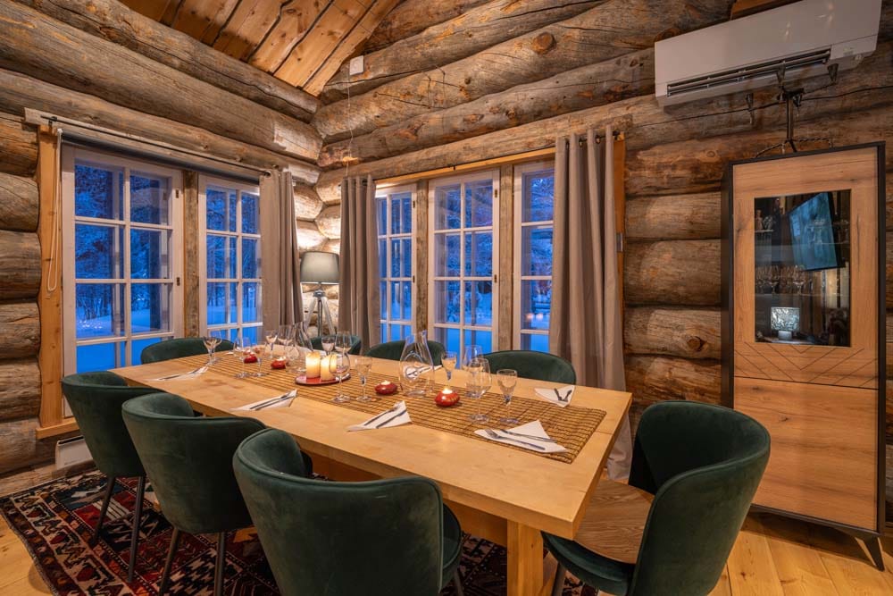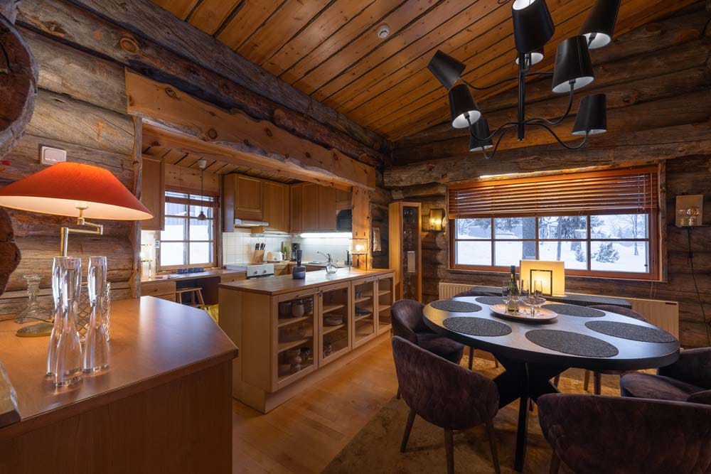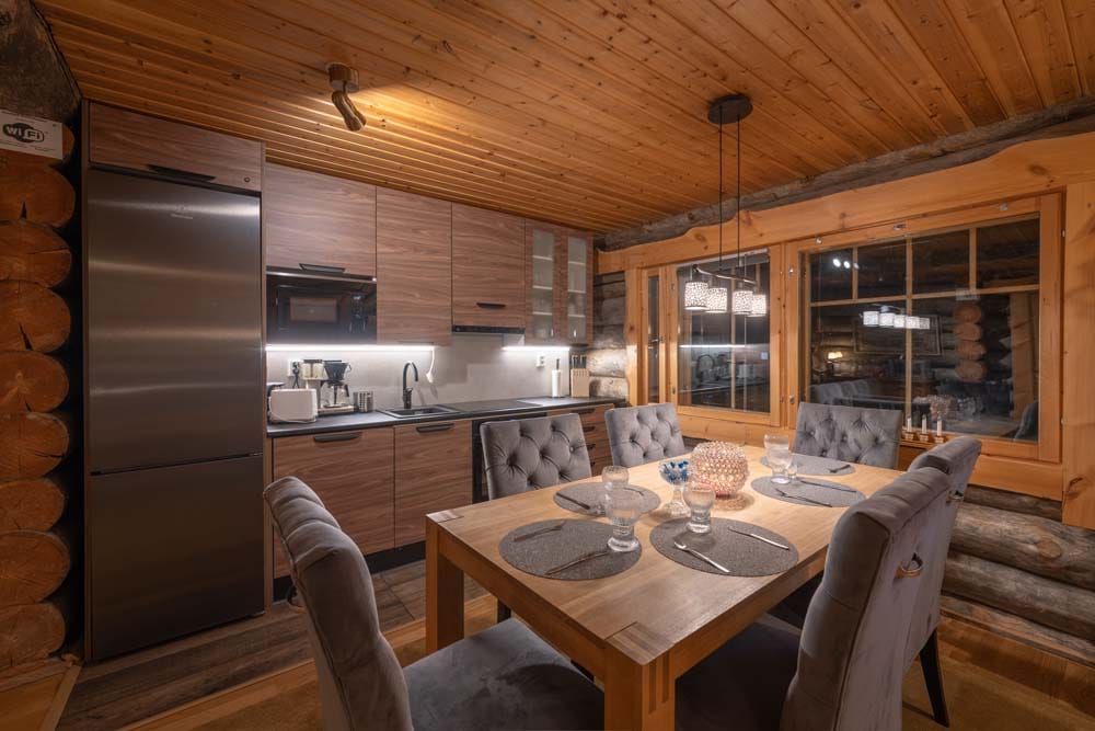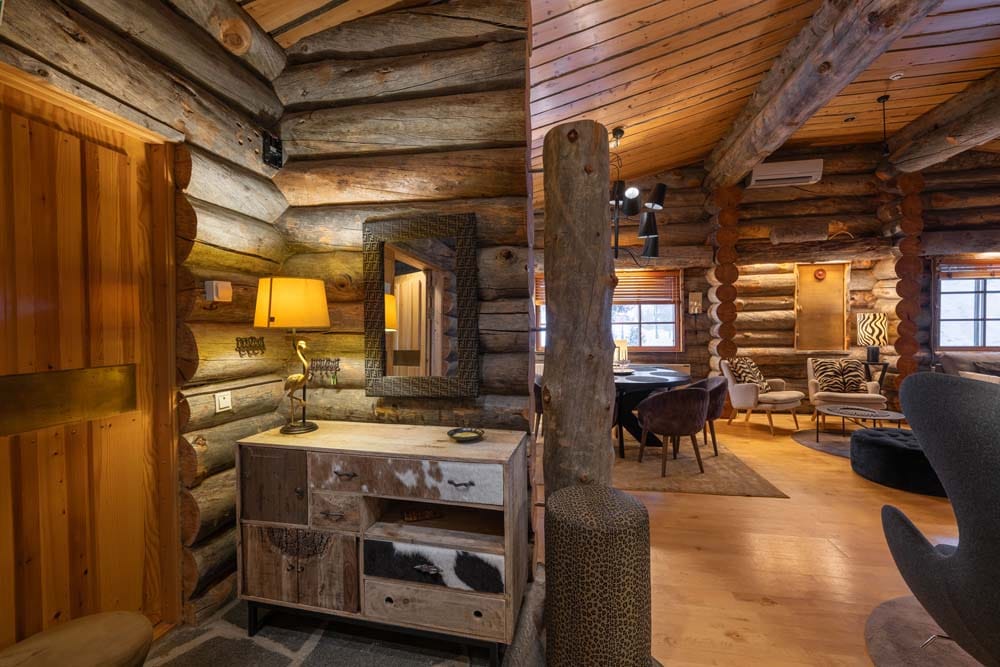 Hirvas is a unique two-bedroom log suite characterized by incredible ceiling height and a spacious living room. A large dining table and atmospheric fireplace bring the group together to enjoy each other’s company. The apartment has a spacious bathroom with two showers and its own sauna, two toilets, a fully equipped kitchen, and its own private hot tub – perfect for relaxation.